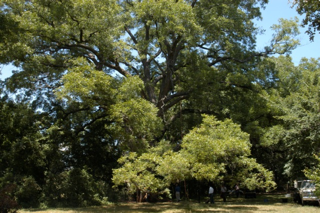 The Champion Pecan Tree in Weatherford, Texas. It is owned by the Finch family. Their farm and the tree are three miles north of the downtown square, on the right side of Highway 51. The property is a white house on the right as you start up the hill from a new bridge over a creek. Check in at the house and then walk past the barn and across a dry creek to the tree. The Finches welcome you, but please be respectful to their property and the tree. Leave your card or a note on where you’re from. This tree was proclaimed the national champion some years ago, but later was supposedly surpassed by a tree in Georgia. I need to see that tree to believe it. There is a picture of the national award in my . This fabulous tree has the following specs: trunk diamater 8′, crown spread 159′ and height 118″.