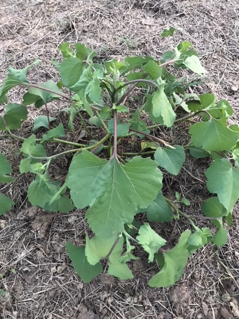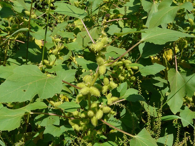 Cocklebur (Xanthium strumarium). Tall, bushy, annual weed with prickly seeds and sandpaper-like leaves. Grows in poor quality soil where excess phosphorous is available to plants.