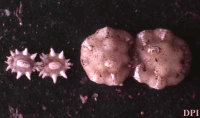 Description: The adult is approximately 3 mm wide; circular, raised, dirty white to pinkish with a wax cover. The nymphs are smaller and star shaped.