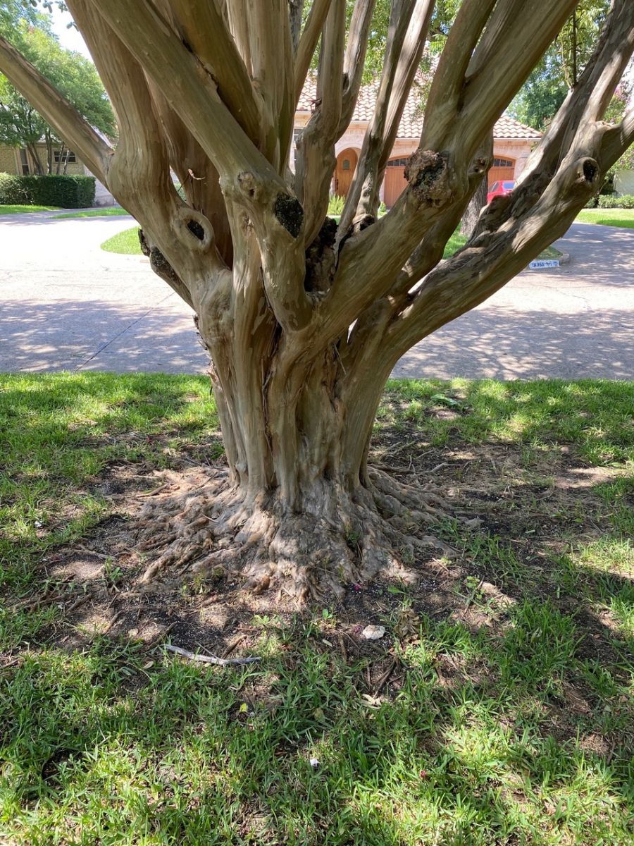 There’s a unique planting of crape myrtles in Dallas that clearly shows the importance of flares. On McCommas Blvd. between Abrams and Skillman you can see an impressive stand of watermelon red crape myrtles. I have long admired this block of trees and just assumed that the homeowners banded together in agreement to keep the trees in their natural shapes and not cover the root flares.