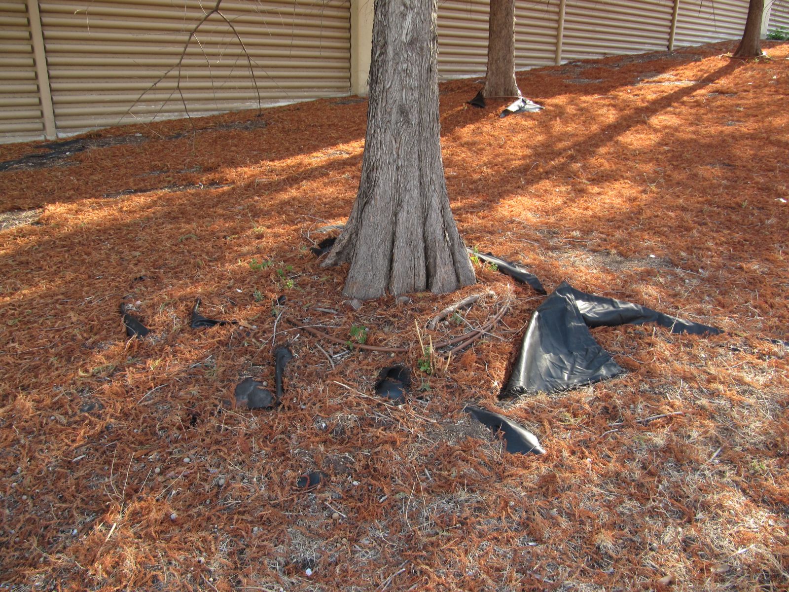 ![]() Plastic sheets or “weed blocking fabrics” should never be used under mulch, especially around trees. Look at the dying bald cypress trees on North central Expressway. |
