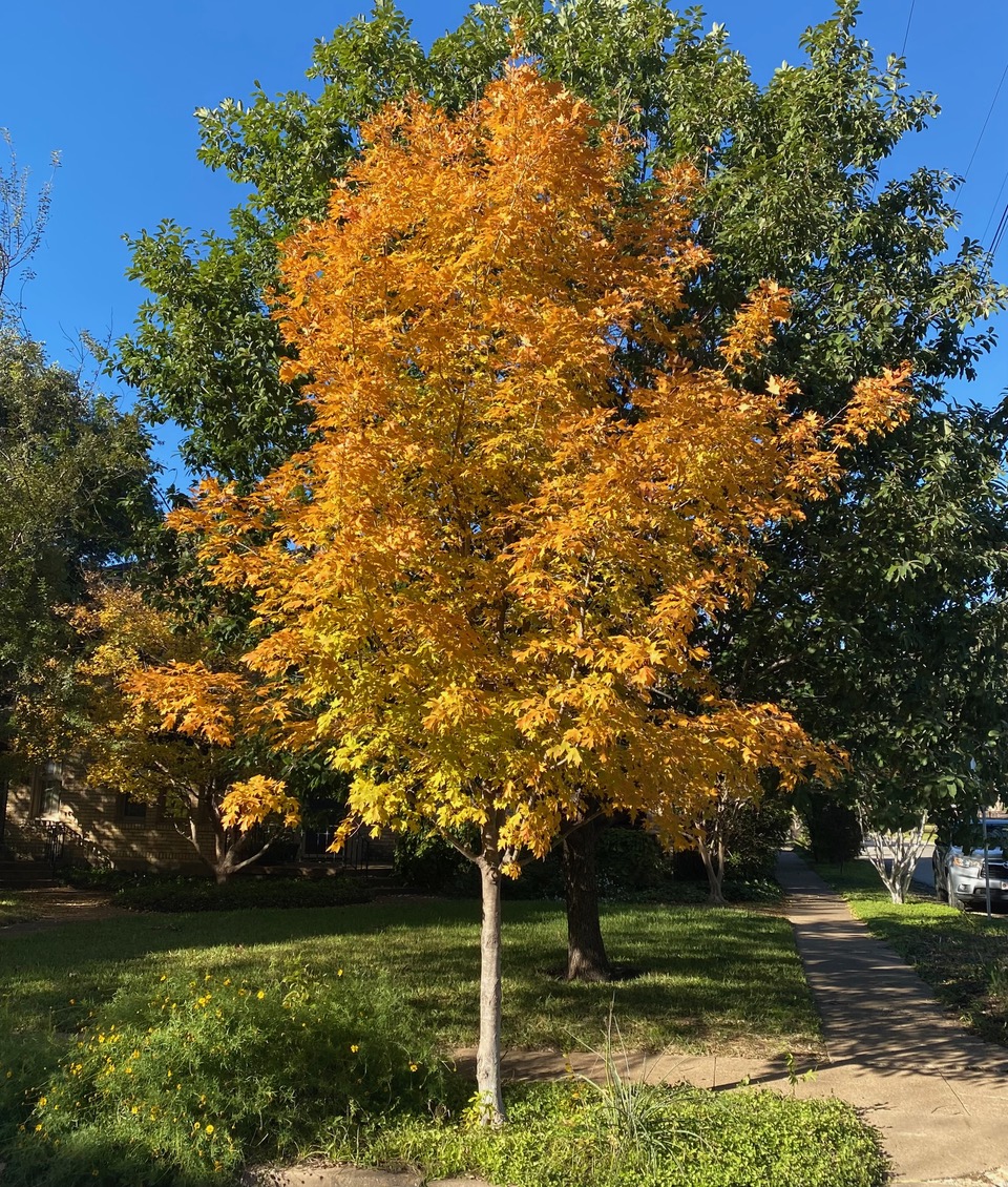 Fall color in north Texas doesn’t hold a candle to the magnificent show that trees in colder parts of the country display, but there are some tree choices that have pretty dependable color. My favorites are Texas red oak, ginkgo, Texas ash, bigtooth and Caddo maple, flame leaf sumac, Persian ironwood, Mexican buckeye, paperbark maple and most all the Japanese maples.