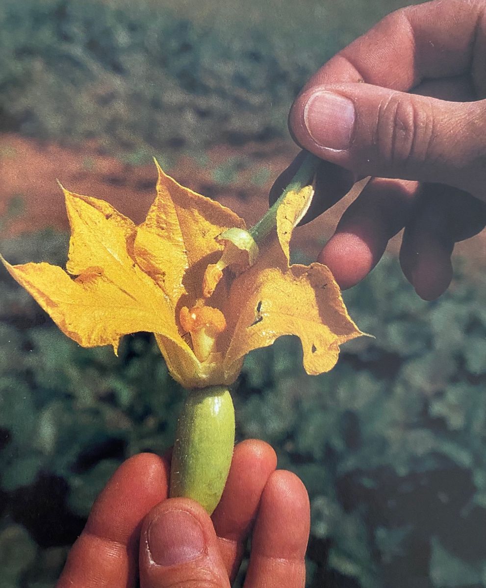 Take the male flower, peel the petals back and dab the center parts on the female flowers that are still attached to the plant. Female flowers are the ones that have the swollen structures behind the flowers.