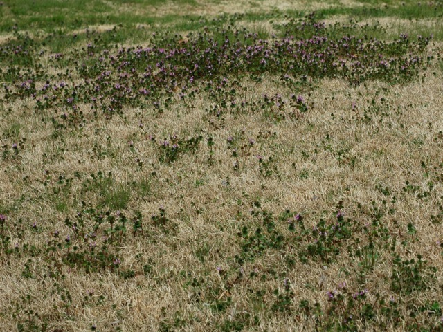 Henbit is a winter annual that reproduces by seed and rooting stems. Henbit stems droop and then turn upright to grow to 16 inches tall. They may root where they touch the ground. They are square, green to purplish and smooth or hairy. The roots are fibrous. ½ to 1 inch long leaves. Henbit flowers are tubular, pink to red to purple. Henbit is often found growing in moist, fertile soils. To control henbit without herbicides, maintain density and health of established turf. Small populations can be hoed or hand pulled or sprayed with vinegar based organic herbicides. Pre-emergence herbicides (corn gluten meal) should be applied in late summer before germination. Mowing usually takes it out because it is taller than the lawn grasses. I actually consider this plant a wildflower.