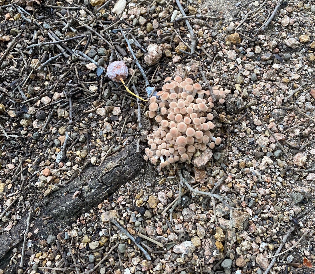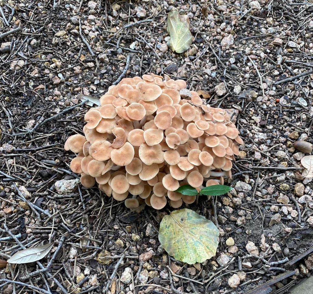 On the other hand, if clumps about one foot in diameter have sprung up around the landscape, there is really no harm in just leaving them – they won’t spread. They aren’t poisonous but definitely wouldn’t taste good to you or the pets. These honey-colored mushrooms typically emerge anytime after the weather cools and often between Thanksgiving and Valentine’s Day.