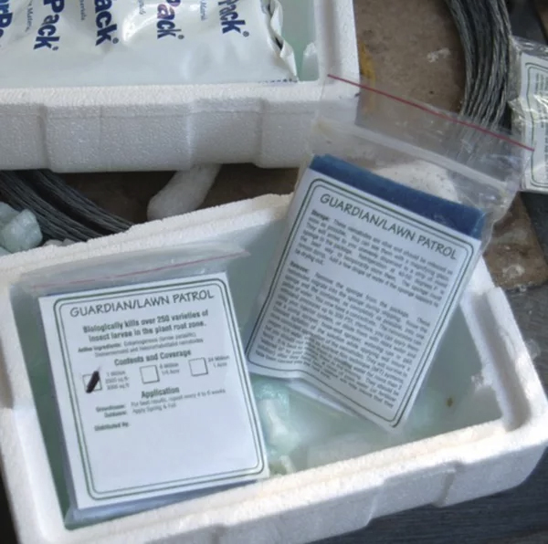 Beneficial nematodes arrive in packets and can be stored for short periods of time at 42 F in the refrigerator