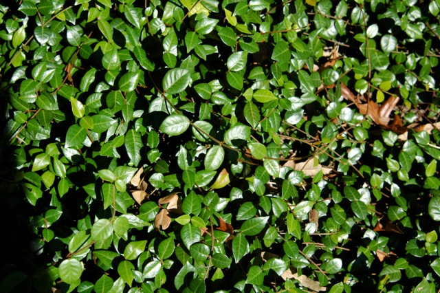 HABIT: Dense, low growing groundcover that will climb but not readily. Small oval leaves, no flowers. A variegated form and a dwarf called ‘Elegans’ now exist. Also called Japanese Star Jasmine and Asiatic Jasmine. Native to Japan and Korea. If any of your Asian Jasmine has flowers, it’s the wrong plant – either Confederate or Yellow Star Jasmine.