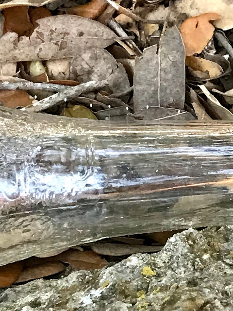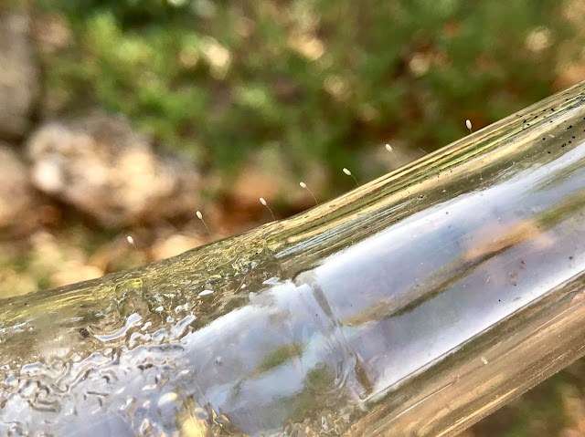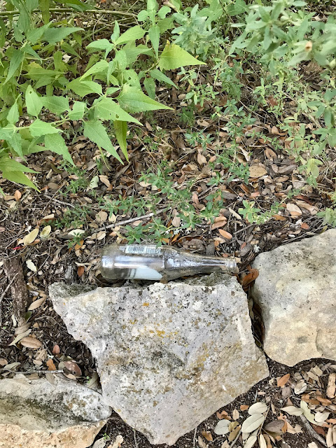 This morning, James went with me to the Blanco Cemetery so I could take headstone photos for FindAGrave.com. When we were done, I treated him to lunch at the DQ. On the way inside, I grumbled as I stepped over a glass bottle in the parking lot. On the way out, I stepped over it again. Only THIS time, I did the right thing and picked it up. My intention was to take it home for recycling. Well, I just happened to notice that a mama green lacewing (Chrysoperla sp.) laid eggs on it! So I held it on the drive home and carefully laid it in a flower bed in our back yard. I’ll recycle the bottle later!