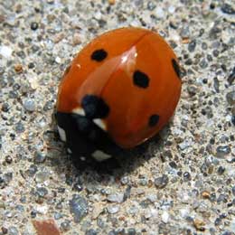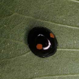 Twice stabbed ladybug – This pretty, shiny black, round ladybug with two red or orange spots on the back is a great friend because it likes to eat destructive scale insects. |