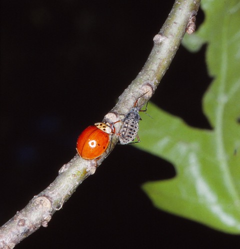 ![]() Harmonia ladybug attacking a giant bark aphid |
