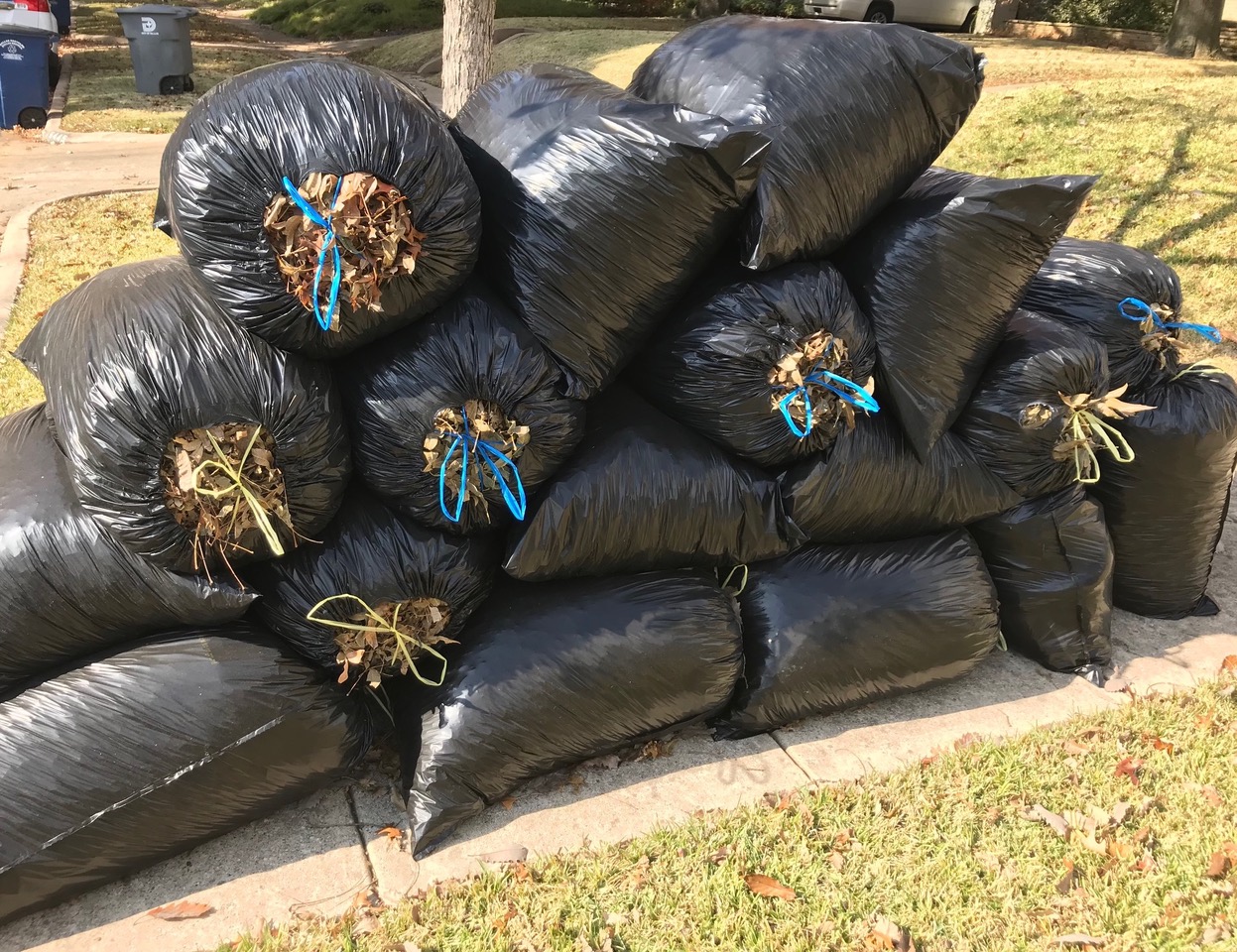 Many years ago in Pittsburg, Texas we managed leaves buy raking them into piles, playing in the piles for a bit, then burning them. Besides being illegal now, especially here in the city, that’s the second worst method of leaf management. First worst is bagging the leaves and sending them to the landfill.
