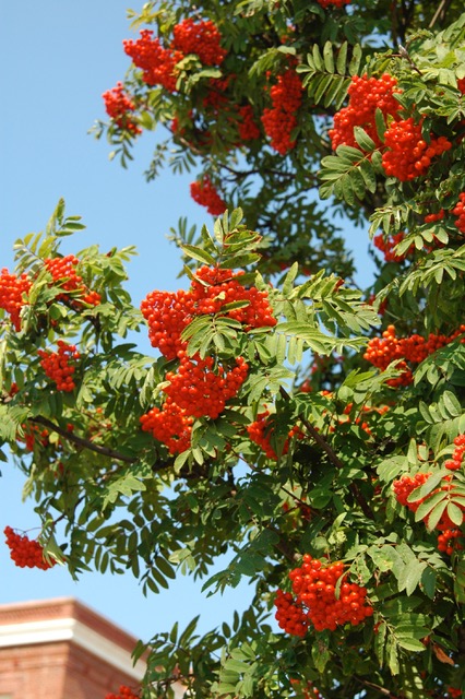 Habits: Small ornamental tree. Height 10 – 30 feet, spread to 10 feet, final spacing 15 to 20 feet. Slow growing and rather short lived in the wild. Bark is thin, gray, light colored, smooth, fragrant with horizontal elongated lenticels becoming scaly with age. Leaves are toothed and compound, alternate, 13 – 17 inches long. Leaflets are finely toothed and tapered, 2 – 4 inches long and 5 – 5 ½ inches wide without hairs. Red fall color. Small creamy white spring flowers in showy flat clusters at the tips of shoots, green in June or July when leaves are mature. Fruit is bright red clusters or berry-like fruits about 1 inch in diameter remain on the tree late into the winter. Color can range from orange to red; one or two seeds in each fruit. Fruits and inner bark have been used for medicinal purposes, berries are edible for humans but very acidic to be eaten raw, can be cooked with meats or made into jelly. Fruit ripens in August. Berries remain on the tree and are available to birds all winter.