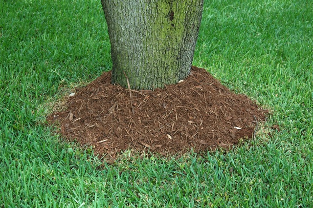 ![]() Very bad tree mulching – dyed wood and piled up on the trunk |