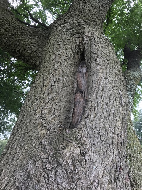 Cavities are big holes or voids in trees where healthy tissue has died and fungi have caused rot. The most common cause of this condition is flush cuts. Carefully removing decayed wood from cavities is OK but fillers such as concrete and foam are not good for the trees and look bad anyway. When removing decayed matter from cavities, be careful to avoid punching into living tissue. Injuries to healthy tissue can introduce further decay into the healthy wood. When cavities hold water, drain tubes are sometimes inserted to release water. Bad idea. Drain tubes puncture the protective barriers between the rotted and healthy wood and allow decay to expand. Tubes also create a new wound in the outside of the tree.