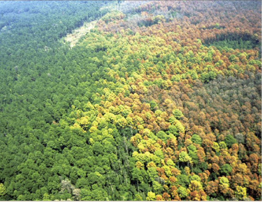 | Figure 2 – Needles on trees killed by beetles fade from green to yellow, red, and brown. |