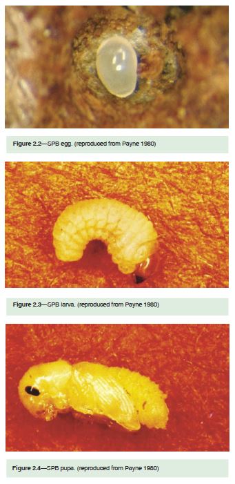 The southern pine beetle over-winters beneath or within the bark in the egg, larval, pupal, or adult stages. Adults emerging during warm winter periods may attack either the same trees in which they developed or nearby uninfested trees.