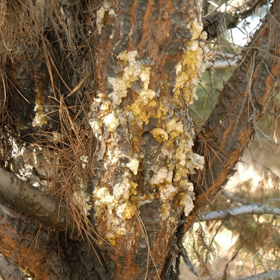 Pitch moth or sequoia pitch moth (Synanthedon sequoiae) larvae sometimes cause only relatively minor injury to the trees because they usually do not girdle the trunk. In other cases they kill the trees quickly. Larval feeding sometimes causes one or a few limbs to die or become weak enough to break. These insects produce copious amounts of resin. The most effective control of this insect is to only plant Afghan (Eldarica) pines in desert or xeriscape situations and don’t irrigate after tree is established.