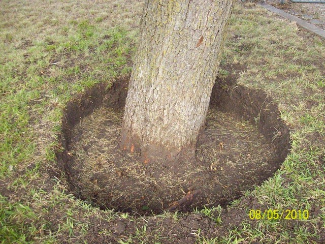 Flower beds should be removed from the bases of trees. The bed prep usually covers the flares and the beds
