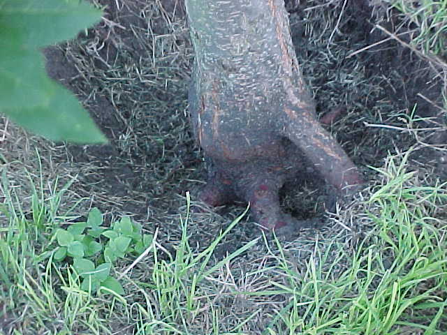 FM: All the fruit trees were bare root and are in their 4th year. Peach tree #1 had some roots crossing over and choking at the trunk. The tree leans, should I expose the root flare on the covered side?