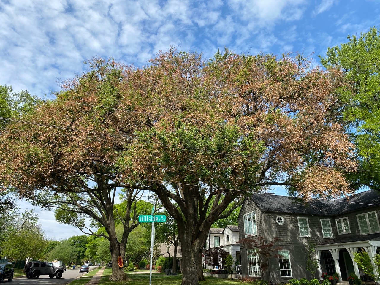 Live oaks show different symptoms completely. Trees that don’t seem wounded have already completely defoliated and sprouted new leaves. Trees with damage are holding onto brown foliage. Trees where this has happened over the entire canopy are in serious trouble and need to have the treatment applied right away. Those with just spots of the clinging foliage are hurt, but there should limited dead limbs to be pruned away at some point.