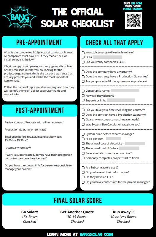 Solar Buyer ChecklistBack to LibraryHome→Library→Solar Buyer Checklist Solar – Buyer Checklist When buying solar, here are some important considerations: 1. Make sure the company has a ECL 2. Get a copy of their warranty 3. Obtain the contact information for the company’s representative
