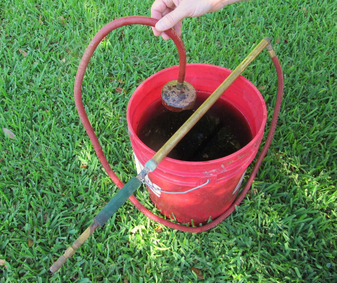 A much better choice is the trombone sprayer. It has a sliding brass barrel connected to a rubber tube that goes down into a bucket of whatever mixture you are using. This sprayer is especially good for foliar feeding with compost tea, fish and seaweed or Garrett Juice, but also effective for applying the organic herbicides as well as insect and disease control products. Some trombone sprayers are bare brass and no handles but the Hudson trombone sprayer has handles and is nickel-coated brass. It’s available from mail order sources such as GardenVarietyOrganics.com.