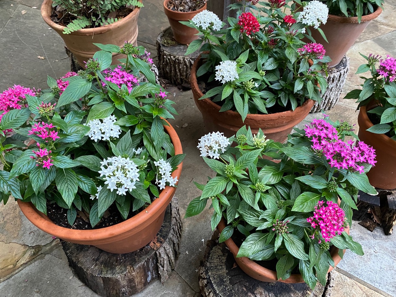 ![]() Multiple colored pentas used in containers for the summer |