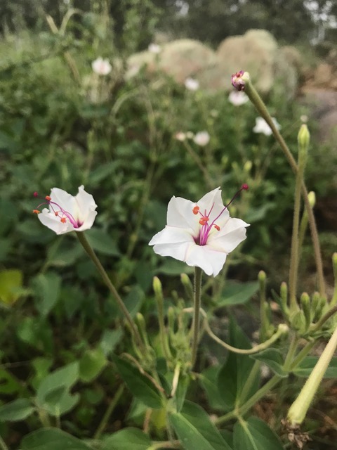 Mirabilis, in Latin, and Maravilla, in Spanish, both mean marvelous, which the flowers are. They open in the shade of the late afternoon. This native species is a close relative of Common Four O’Clock (M. jalapa), a plant originally from Mexico, popular in gardens since the Aztecs, and now commonly escaping into the wild. It has purple, yellow, or sometimes white or variegated flowers generally not longer than 2 1/2.