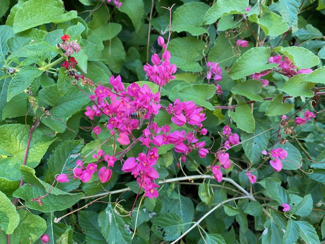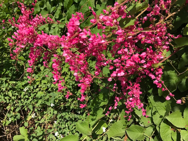 Coral Vine is in the Polygonacea or Buckwheat family, and is a fast-growing vine that in North Texas generally dies back to the ground every winter. There are three colors: pink, red, and white, and the pink seems to be the most cold hardy, especially north of USDA Hardiness Zone 8. In frost-free climates the vine is evergreen. Other names include Bee Bush, Mexican Creeper, Queen’s Wreath, Hearts-on-a-chain, Heavenly Vine, Coralita, and San Miguelito Vine.