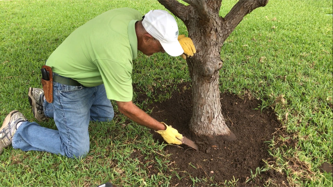 The first and most important step of the Sick Tree Treatment is removing the soil and mulch from the bases of the trees. Almost all trees and other woody plants have been planted too deeply. They are usually too deep in the containers when purchased from the nurseries, get planted too low and then have too much mulch added on top. The result is severely buried flares. The flares are part of the trunks (not the root systems) and should be exposed to air. The root flares (or trunk flares) of the trees should be dramatically exposed, not just barely exposed.