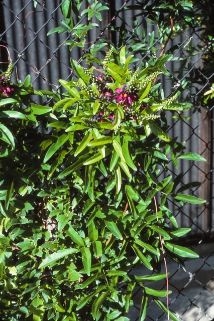 HABIT: Vining plant for full sun that is mostly evergreen. Purple summer blooms in late summer to early fall. Evergreen shiny foliage.
