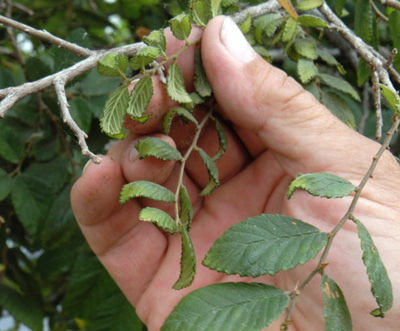 Herbicide damage – toxic chemical herbicide damage results in deformed twigs and leaves and often smaller twig growth and leaves. |