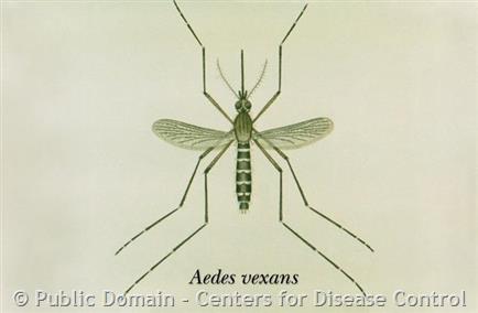 Aedes vexans is a floodwater mosquito that is very common in the Greater Yellowstone Ecosystem. The adult female bites preferably cattle and humans during the day as well as in the evening and night. Both females and males feed on nectar, honeydew, and sap. Females typically lay their eggs after a blood meal in areas associated with standing water. The adult form of this species can be found from May through October.