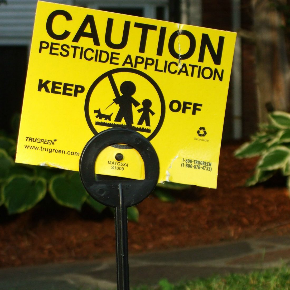 The last thing an organic gardener wants to find poked into their lawn: sign of a chemical assault