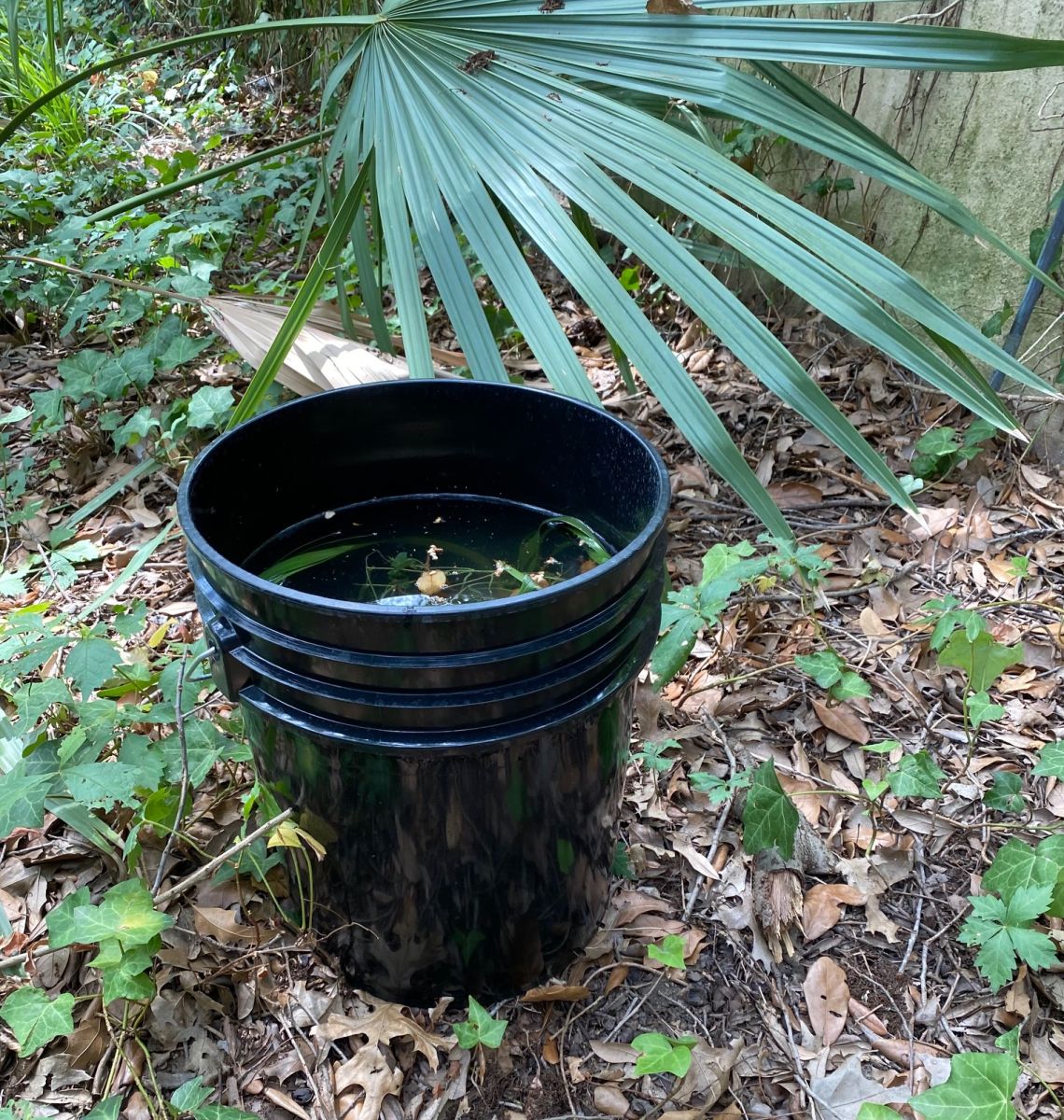 Any buckets or other containers will work, but 5 gallon buckets are my favorite. Black ones are the best since they blend into the landscape so well, but any color is okay. They can be put behind things and in utility and greenhouse areas and show up even less. Fill the buckets with water and add several handfuls of leaves, twigs, weeds, grass clippings, food waste, etc. forming a stagnant bucket of cruddy water. This will cause it to attract female mosquitoes to lay their eggs.