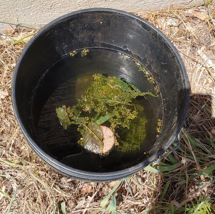 Into the buckets of stagnant water toss a small handful (jigger full or so) of Bti (Bacillus thuringiensis ‘Israelensis.’ You can break off pieces of one of the Summit Mosquito dunks or just use the Mosquito Bits granular product. Larvae die from the Bti as they hatch.