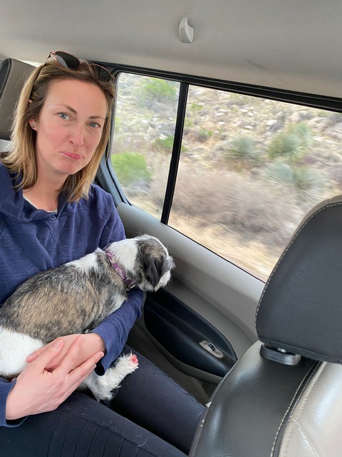 Little, bloody paws, and scared, she wasn’t afraid of Midge at all and crashed asleep in Logan’s arms. We called back to the restaurant – no reports of a missing dog, so we headed the rest of the way down the mountains to the first vet office we could find. The one we found was great, cleaned her and told us the blood was from wearing her nails down to the quick on the pavement. Her pads were worn red and tender as well. We later sprayed her little paws with food grade hydrogen peroxide and it seemed to help right away and she was able to walk on a leash the next day.